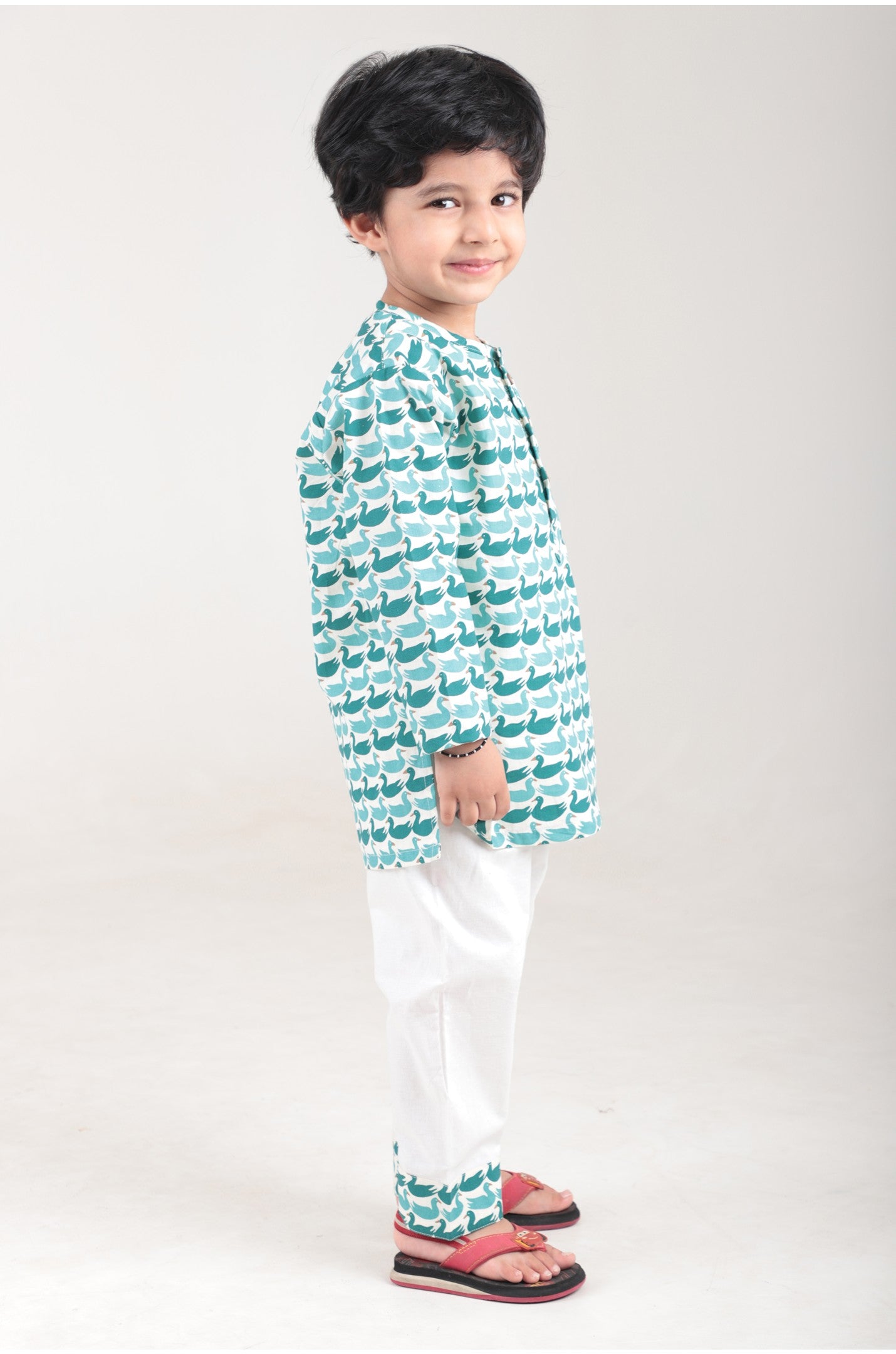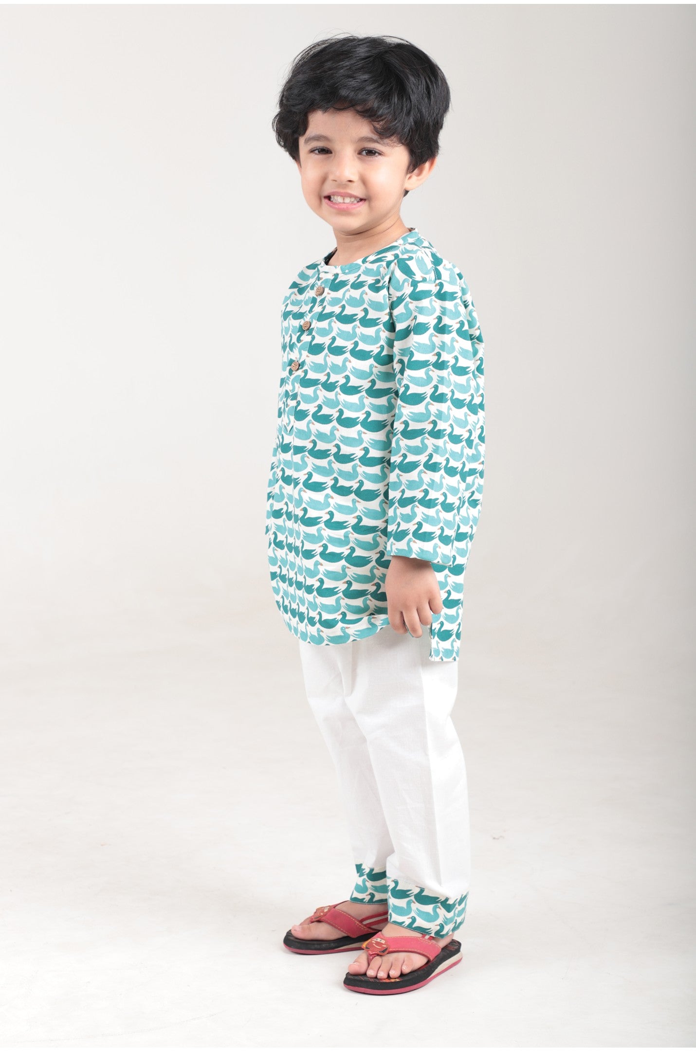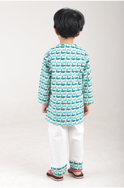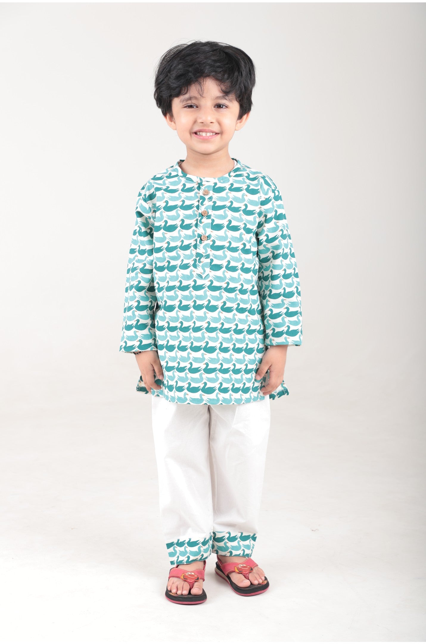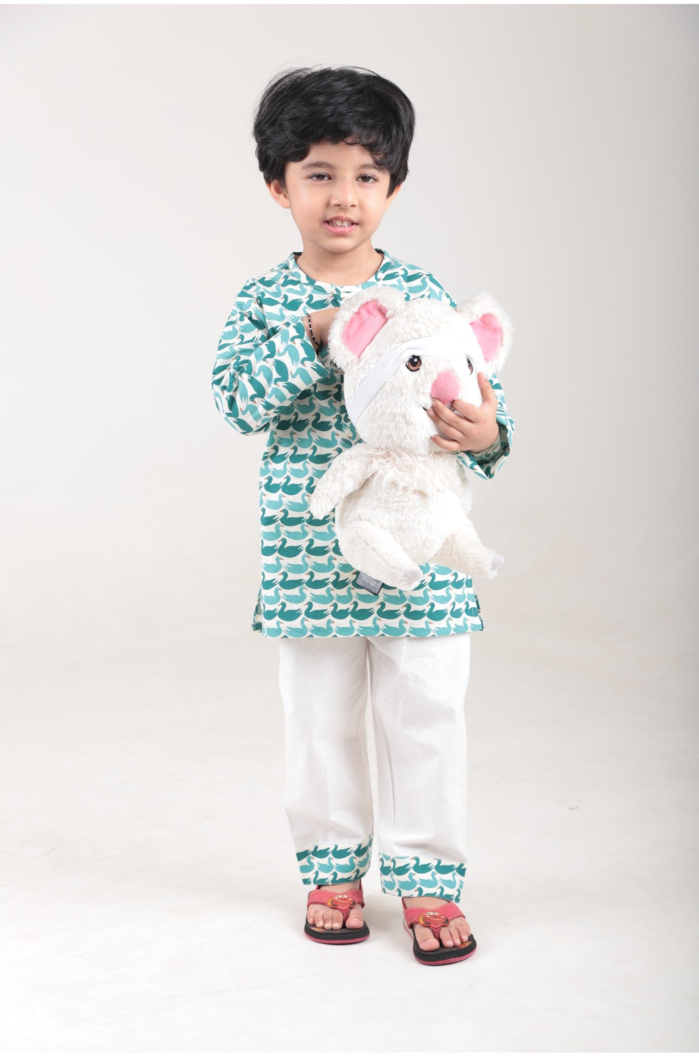 Polka Tots Full sleeves Swan print Nightwear Kurta pyjama set - Green
