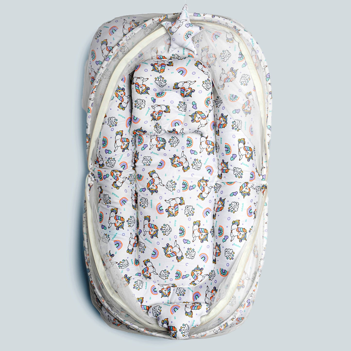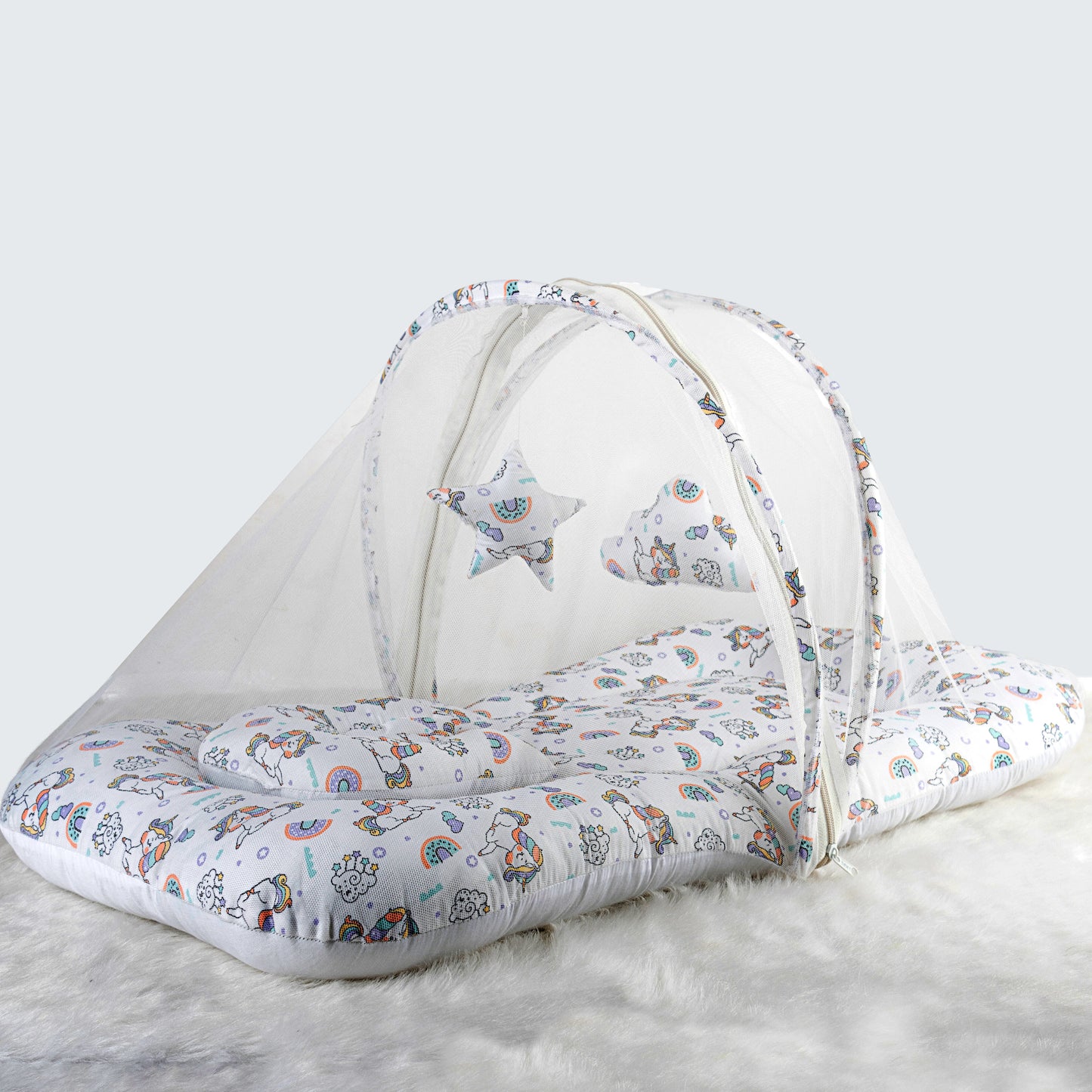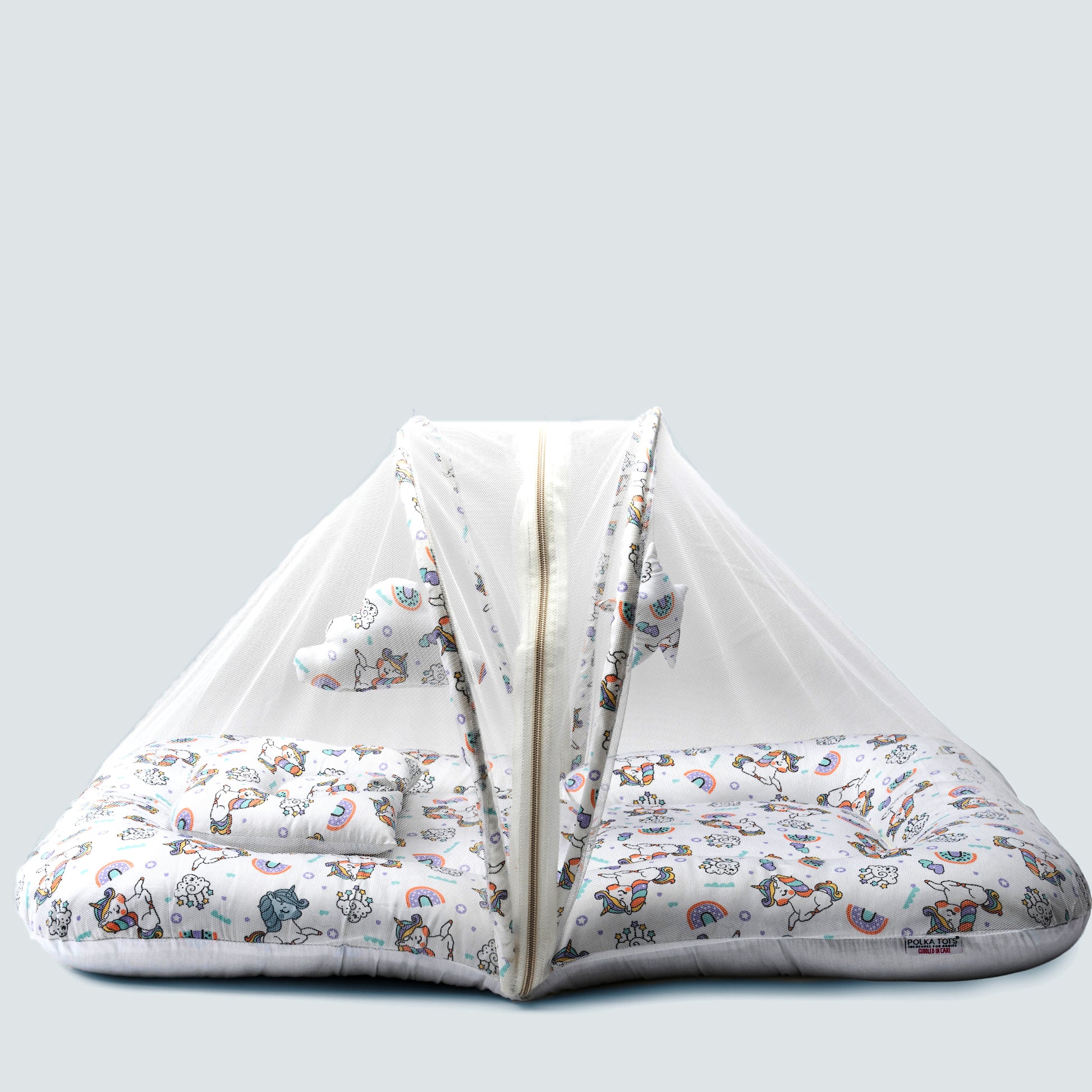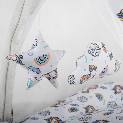 Polka Tots Cotton Baby Bedding Mosquito Net Set with Dangling Toys - Unicorn print White