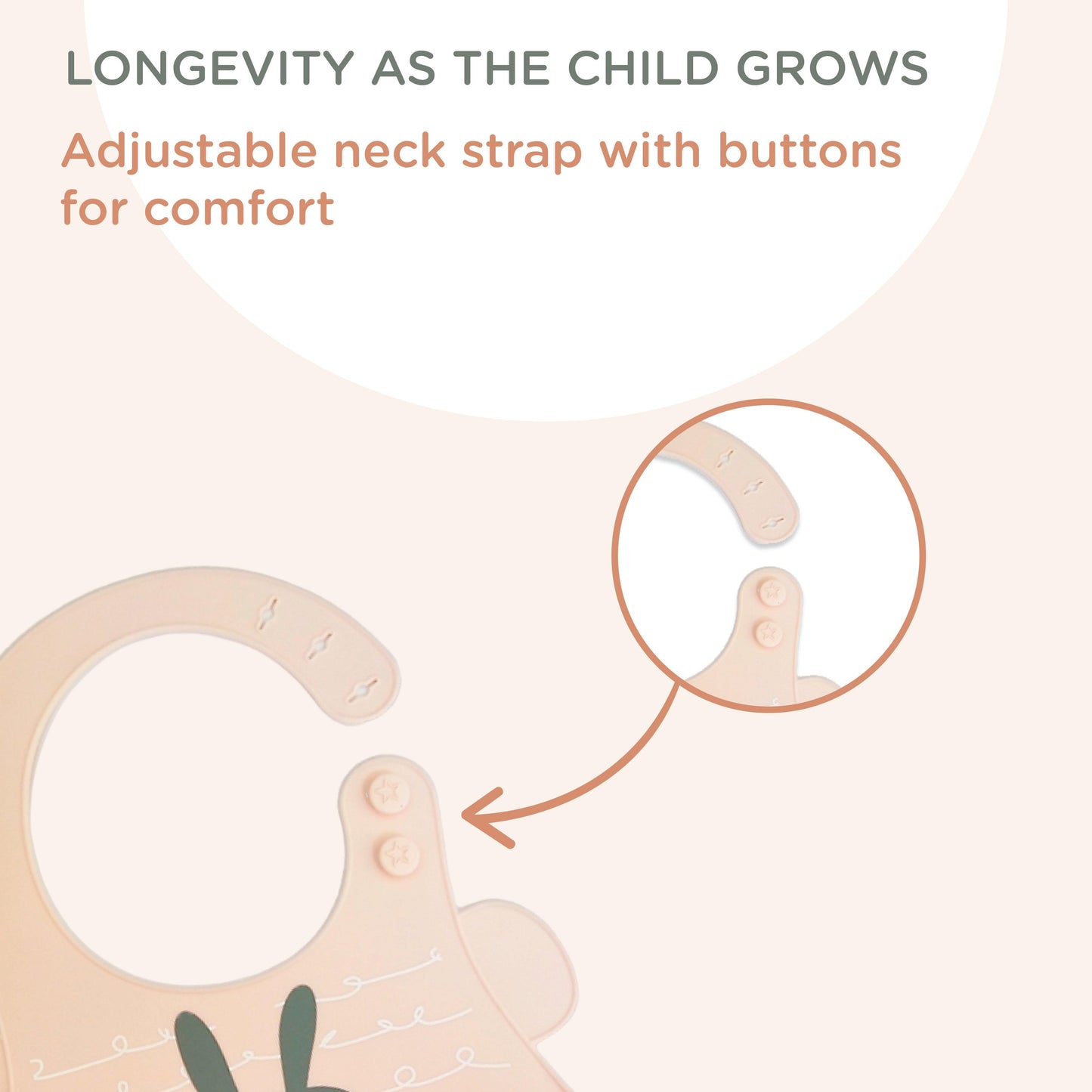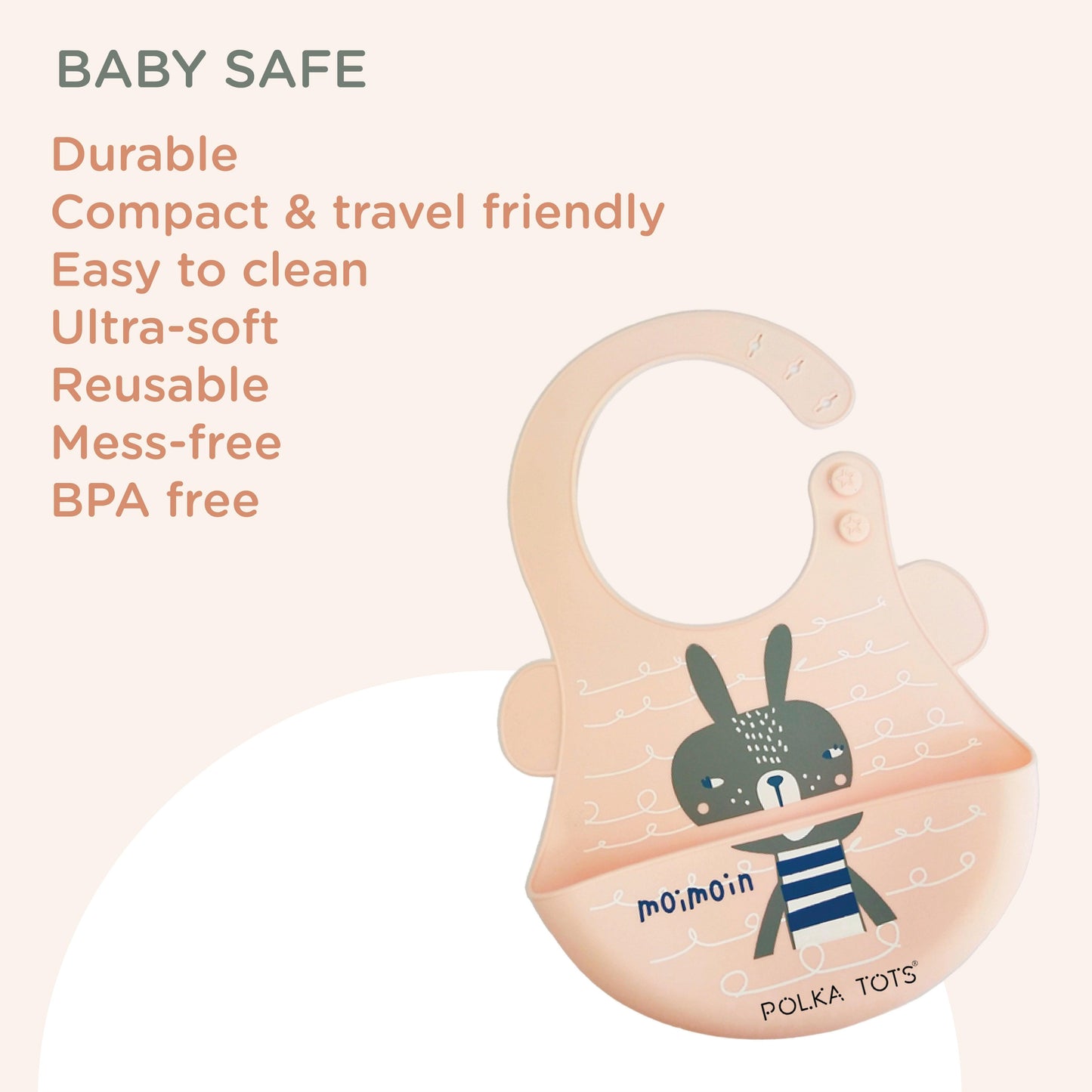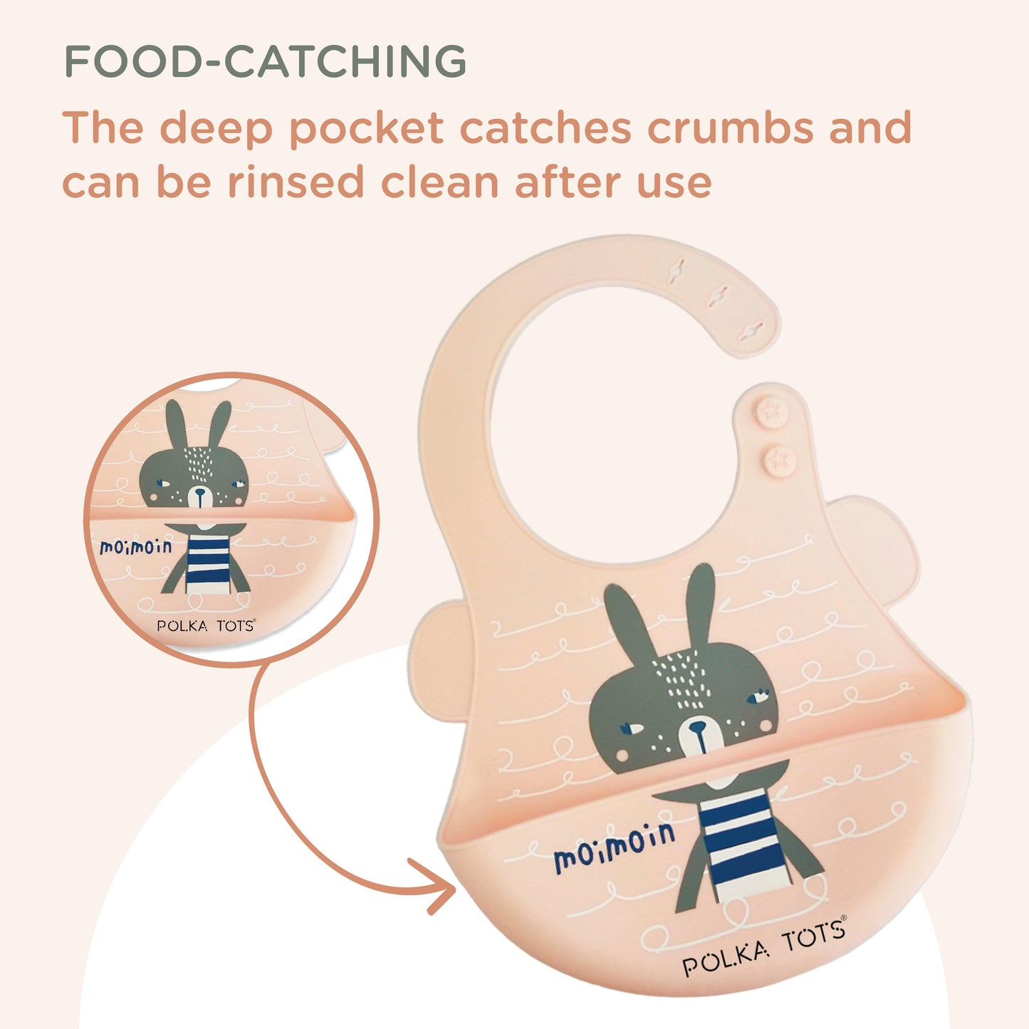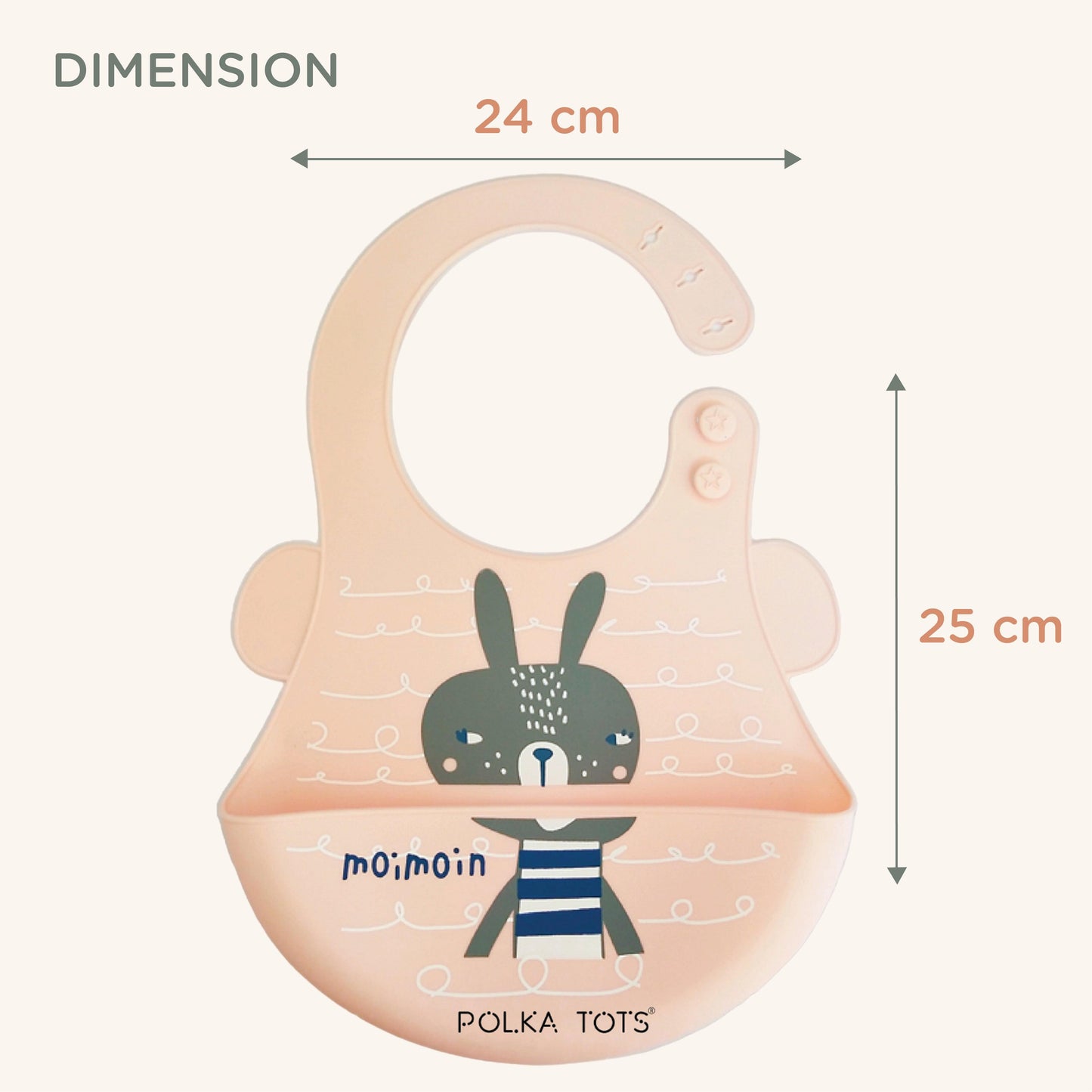 Polka Tots Waterproof Silicone Bibs with Pocket and Adjustable Snaps (Peach Bunny)